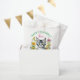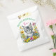 Un gatito de rayas grises bonito en una cama de flores amarillas y rosas color agua color chica fiesta de cumpleaños bolsos de favor.
