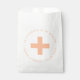 Para que el kit de emergencia (también conocido como Hangover Kit) ponga en la bolsa de bienvenida de la boda de destino, con algo de medicina dentro. Tiene una cruz en el centro y un texto en arco haciendo un círculo alrededor de ella. Encima está el mensaje "En la enfermedad y en la salud" y debajo están los nombres de la novia y el novio y la fecha. El texto está en mayúsculas. El texto y la cruz son color melocotón, el fondo es blanco.