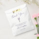 Bolso de bienvenida con flores de lavanda ramo y gracias nota en color lavanda oscuro con nombres de pareja y fecha boda