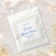 Haz que tus favores de ducha de novia sean aún más especiales con estas elegantes bolsas de favores con tema de limón. Con un delicado patrón de limón y hojas pintadas a mano, un marco de vieiras azul y una tipografía de escritura clásica, estas bolsas le aportan un fresco encanto mediterráneo a su evento. Perfecto para envasar dulces, pequeños regalos o favores de fiesta en una ducha de novia con temática cítrica, fiesta de jardín o celebración de inspiración italiana. Personalice con el nombre, la fecha y la ubicación de la novia un detalle personalizado y de moda que lo vincule a todo con gusto.