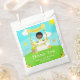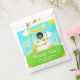 Esta bonita y extravagante bolsa de favores tiene un hijo de pelo negro con piel oscura en un puesto de limonada amarilla decorado con flores y lienzo. En el fondo hay un cielo azul, sol y mariposas. El texto combina fuentes decorativas y sans serif para un estilo elegante y moderno. Esto es perfecto para una fiesta de cumpleaños de verano. Gráficos de MUJKA
