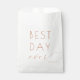 This elegant wedding favor bag design exudes a timeless and sophisticated charm with its minimalist style. The text "Best Day Ever" is presented in an inviting mix of uppercase and cursive typography, adding a touch of romance and celebration. Set against a soft white background with delicate gold accents, the color palette enhances the overall sense of joy and refinement. Perfect for commemorating special moments, this design captures the essence of love and happiness, making it ideal for weddings or other memorable events. Its clean lines and subtle elegance ensure it complements any decor while leaving a lasting impression on guests.