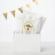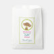 Bolsos de favoritas para la ducha de bebé. Diseñado con un mono bebé adorable que sujeta un pacificador en su boca dentro de un círculo con un borde verde oliva. Las letras de la palabra bebé están colgando de una flecha de estilo boho. El texto dice gracias y está listo para ser personalizado con el nombre de su invitado de honor.