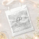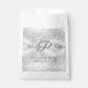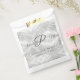 El diseño presenta un fondo blanco de satinado falso para el monograma de la pareja recién casada. Center muestra el nombre inicial del apellido en un tipo de letra grande, elegante y plateado. La primera inicial de novia y novio se muestra en ambos lados en el mismo tipo de letra, pero más pequeña.