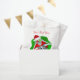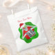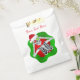 Esta bolsa de favores de partido tiene un gracioso esqueleto sosteniendo adornos de árbol de Navidad hasta sus ojos con un sombrero de Santa roja dentro de un círculo rojo brillante y verde ondulado. Personalizar el texto con la plantilla.