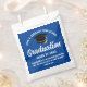 Esta moderna bolsa de favores de la fiesta de graduación de personalizado superior azul y blanco incluye tu nombre de instituto o universidad para la clase de 2025. Personalizar con tu año de graduación bajo el guión manuscrito de la moda y gorro negro para un gran regalo de graduación personalizado.