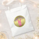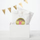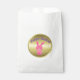 Una adorable bolsa de favores de Pascua (perfecta para que los más pequeños puedan recoger sus mini huevos en la caza de huevos de Pascua) que incluye un conejito rosa dulce de Pascua con una bufanda alrededor del cuello. Encima de ella está el saludo en morado, 'Pascua feliz' (que se puede personalizar para acomodar) y detrás de ella hay un brillante círculo dorado.