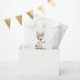 Bolsa de favores para tus tratamientos de Pascua con un ilustracion de un niño pequeño vestido con un traje de conejo durante una búsqueda de huevos. Genial complementar los tratamientos de clase de tu hijo. Personalice el texto con su propio texto. Ilustrado y diseñado por Patricia Álvarez.