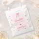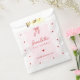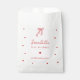 The PRIYA girl little sweetheart birthday treat bag has a light pink and white striped background with a wavy pink frame and red hearts topped with a red coquette bow. Script and serif fonts in red with all editable text completes this little sweetheart 1st birthday party treat bags for Valentine's birthday decorations.