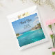 Favor de las bolsas con una hermosa foto con un resort de playa tropical. agua azul bonito y playa de arena blanca con cabañas de paja que le confieren un ambiente tranquilo a la isla. Un círculo blanco se cubrió por encima con el texto dentro.