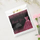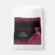 A beautiful plum purple themed elegant watercolor dress gown on a black background with faux glitter at the top and bottom of the favor bag.