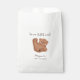Bolso de favores para bebés con el tema del oso o el bosque, con el ilustracion de un cachorro rodando por la espalda. El texto dice "¡PODRÍAMOS esperar!"