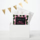 Hermosos Rosas color rosa y un brillante patrón de vegetación con un cuadrado enmarcado de color negro y rosa caliente que alberga el Gracias por la tipografía que viene, el dulce chica de los dieciséis cumpleaños, el título del evento Sweet Sixteen y la fecha del evento. Los mismos arreglos florales y el mismo patrón también aparecen en varias ideas de regalo a juego y en la decoración fiesta de la Colección Fiesta Rosa en Negro - Elegante y Moderno.
