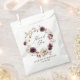 Bolsas de favores de boda rústicas de otoño con "Gracias" exhibidas en un elegante guión caligráfico rodeado por una corona de flores acuarelas y follaje en tonos marsala, burdeos, violeta, crema, marfil, marrón y naranja de óxido. Personalice los bolsos de favoritas de boda floral de otoño con sus nombres y fecha de boda. Diseñado para coordinar con nuestra colección Rustic Autumn Floral boda.