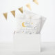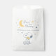 This is a delightful paper favor bag, perfect for filling with treats or small gifts for a baby shower. The white bag features a charming design centered around the theme "Over the Moon". It includes the sweet illustration of Snoopy sitting, along with a crescent moon and scattered stars in soft yellow and gray tones. The bag is personalized for the event and features a decorative, scalloped top edge. This provides a wonderfully coordinated, nostalgic, and cute way to package party favors for guests.