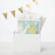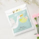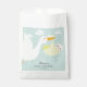 Una linda cigüeña blanca lleva a un bebé en un bulto amarillo por el cielo, perfecto para bolsas de favores unisex o de fiesta de bebé neutra de género. Invitaciones, platos, servilletas, pegatinas y más.