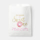 ¡Gracias a los invitados de la manera más dulce con esta bolsa de favores "Sweet One" con la temática de los donut! Con fuentes rosas y doradas, una capa de agua helada y rociadas juguetonas, es la adición perfecta a una tienda de donut, rociada o un primer cumpleaños inspirado en panadería. Personalice con el nombre de su hijo el envío de un fiesta memorable.