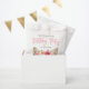 La fiesta de cumpleaños de los gatos más bonitos presenta un guión rosa caprichoso con un gato color agua gris y blanco con una corona de flores rosadas y malvas cerca del fondo del diseño. Personalice la fiesta de cumpleaños de tema del gato con el nombre del chica de cumpleaños, la edad y la fecha.