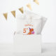 Bolsas de cumpleaños de dinosaurios personalizados para niños con feliz T-Rex llevando un bizcocho y usando un gorra fiesta para la ocasión.