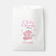 Super lindo bolso de favores de ducha de bebé con un lindo estilo moderno de mediados de siglo de cocina hervidor y taza de té rodeado de corazones de amor rosa bonito. Un diseño tan divertido con guión sofisticado y fácil de personalizar con un nombre personal. Una favorita con mujeres sosteniendo fiestas de té con ducha de bebé.