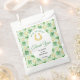 A charming St. Patrick’s Day baby shower favor bag featuring a soft green background, golden horseshoes, and scattered four‑leaf clovers for a sweet “lucky charm” theme. The central white oval frames the event details beautifully, creating a warm, welcoming design perfect for celebrating a growing family. Ideal for March celebrations, Irish‑inspired themes, or any baby shower that embraces luck, joy, and new beginnings.