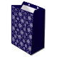 Bolsa de regalo azul con patrón de copo de nieve. Patrón decorativo de copo de nieve blanco sobre fondo azul oscuro. Esta es una elegante y clásica bolsa de regalo para muchas ocasiones durante la temporada invernal, tanto Navidades en temporada de vacaciones como cumpleaños y eventos de invierno. Viene en diferentes modelos y tamaños. Envoltura fácil, rápida y lujosa.