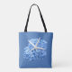 Bolsas de regalo de bodas en la playa con flores de hidrangea azul y diseño de pez estrella. Desde la línea de diseño del Seaside Garden, esta bolsa blanca tiene un gran diseño floral azul con una temática playera. Personalizar con una línea de texto en la parte superior, con nombres y fecha, o nombre de la dama de honor. Las flores de hidrangea realistas tienen una estrella marina blanca atrapada en los pétalos, lo que hace un diseño hermoso para cualquier boda con temática marina. Este gran tote se puede dar a los miembros de la fiesta nupcial, o a los invitados que asistan a una celebración de destino.