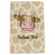 Ilustracion de la cabeza de vaca. Fondo de patrón de vaca sin foco. Texto personalizado en ambos lados.