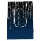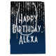 Filas del diamante de imitación brillante colgante en fondo azul gradiente y negro para cumpleaños. El texto/nombre se puede cambiar o eliminar.