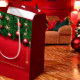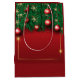 Una bolsa de regalo roja y festiva adornada con ramas de pino verde y adornos rojos brillantes. La bolsa tiene un acabado brillante, realzando sus colores vibrantes. Las manillas son blancas, lo que contrasta notablemente con el rico fondo rojo.