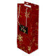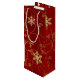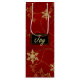 Bolsa de regalo de vino festivo hecha en rojo rico, con torres dorados, hojaldre y copos de nieve. La parte delantera de la bolsa de vino tiene un área de texto rectangular negra, con texto gráfico dorado que lee JOY.