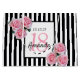 Rayas verticales clásicas delgadas en blanco y negro como fondo. Con flores negras, femeninas y románticas rosas, rosas como decoración. Perfecto para una elegante fiesta de cumpleaños número 18 para ella. Marco blanco y negro con plantillas para el nombre, la edad y una fecha. Edad número 18 en rosa, nombre y fecha en negro. El nombre se escribe con un guión de estilo con letras a mano.
