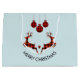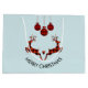 Una gran bolsa de regalo que dice "Feliz Navidad" en texto curvo. Diseñado con un ilustracion de 2 ciervos Navidades saltando. Los ciervos están hechos de leñadores rojos y negros, con un poco de corazón entre ellos. Las decoraciones de Navidad rojas y negras se cuelgan desde arriba. Fondo azul claro.
