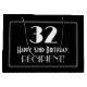 El diseño de esta bolsa de regalo inspirada en el estilo de los años 1920-1930 presenta un gran estilo Art Déco inspirado en el número "32", el mensaje "Feliz cumpleaños número 32", un nombre personalizado, y un patrón de frontera que consiste en líneas delgadas. El fondo es negro de color. Una bolsa de regalo como esta se puede usar cuando se le dan regalos al envasado a alguien en celebración de su 32 cumpleaños. [~Z0000496]