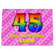 Este diseño de bolsa de regalo con tema de cumpleaños número 45 es animado y feliz, y presenta un gran número "45" con un patrón inspirado en la apariencia del espectro del arcoíris. También incluye el mensaje "Feliz cumpleaños número 45" y un nombre personalizado. El fondo presenta un patrón de rayas rosadas claras y rosadas oscuras que contienen formas de corazones rosados llenos de amor. Una bolsa de regalo como esta podría usarse al envolver regalos o obsequios que se dan para celebrar el cumpleaños número cuarenta y cinco de alguien.
