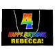Este alegre, divertido y colorido diseño de bolsos de regalo de cumpleaños incluye un gran número "4" y el mensaje "FELIZ CUMPLEAÑOS", ambos coloreados con un patrón inspirado en el gradiente del espectro arcoiris, junto con un audaz nombre de destinatario editable amarillo. El fondo es negro de color. Una bolsa de regalo divertida como esta podría ser usada cuando se le dan regalos al envasado a alguien en celebración de su cuarto cumpleaños. [~Z0000477]
