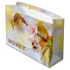 Abeja de miel sobre flores rosas de un cerezo japonés - sakura. La belleza de la temporada de primavera. Tonos suaves rosa y amarillo. Impresiones y regalos para cualquiera. Bolsa de regalo horizontal. Puede cambiar o eliminar la imagen y el texto de la plantilla, Honey.