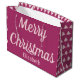 Feliz Navidad está en un guión rosa pálido en el frente y en la parte trasera. El texto de presentación en color rosa claro para un nombre se encuentra bajo el guión. Un patrón de árboles de Navidad rosa pálido aparece en el lado de esta bolsa de regalo de Navidades rosados oscuros.