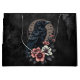 Majestuoso cuervo negro sentado orgullosamente en medio de un exuberante grupo de flores delicadas. El cuervo, con su pico puntiagudo y su ojo rojo penetrante, exuda una aura misteriosa. Sus plumas están meticulosamente detalladas en un estilo realista, destacando la textura y el brillo de su plumaje. A su alrededor se despliega una combinación armoniosa de delicadas flores en tonos suaves rosa y blanco. Los pétalos de las flores son suaves y delicados, casi parecen susurrar en la luz suave. Esta composición contrastante entre el cuervo poderoso y las flores frágiles crea un fascinante equilibrio entre fuerza y gracia,