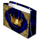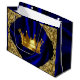 Bolsa de regalo de la ducha de bebé príncipe con una hermosa corona de oro sobre un elegante fondo azul real y dorado. Esta bolsa de regalo de príncipe se personaliza fácilmente con el texto de su elección, y usted puede mover y redimensionar la corona según sea necesario.