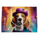 Un Beagle juguetón vestido con un disfraz vibrante y caprichoso contra un telón de fondo brillante y mágico. Este encantador diseño es perfecto para los amantes de los animales.