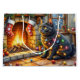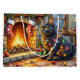 A cozy and enchanting Christmas artwork featuring a beautiful black cat sitting beside a warm fireplace adorned with stockings and twinkling Christmas lights. This festive scene captures the mysterious charm and elegance of the black cat, making it a perfect piece for cat lovers and holiday home decor. Add a touch of magic, warmth, and feline grace to your Christmas celebrations with this delightful artwork.