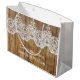 Gran y elegante bolso de regalo de boda hecho en un moderno estilo de color fresco y patrón de encaje blanco. Una etiqueta de área de texto blanca de estilo clásico tiene texto personalizado, a ambos lados del bolso, listo para personalizar. Hermosa bolsa de regalo perfecta para bodas, aniversarios, Navidades y para cualquier cumpleaños.