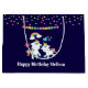 Bolsa de regalo de cumpleaños feliz con 2 unicornios adorables bailando con colas brillantes y coloridas, y hombres. Un arcoíris colorido con nubes en cada lado sobre sus cabezas. Otros elementos son una flor, un corazón y algunas estrellas. Fondo morado oscuro. Coloridos puntos de confeti y una concha de imagen a lo largo de la parte superior.