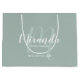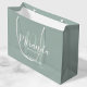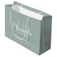 Bolsa de regalo para damas de honor personalizada que incluye el nombre de la dama de honor en blanco estilo de letra de escritura moderno y monograma con estilo de letra sage verde moderno estilo de escritura como fondo con título y fecha boda en sans modernos blancos estilo de fuente serif en color verde sabio. También es perfecto para criada de honor, chica de flores, madre de la novia y más.