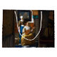 Johannes Vermeer (octubre 1632 - diciembre 1675), en el original holandés Jan Vermeer van Delft, era un pintor neerlandés del periodo barroco que se especializaba en escenas internas de la vida de clase media. Durante su vida, fue un pintor provincial de género moderadamente exitoso, reconocido en Delft y La Haya. Sin embargo, produjo relativamente pocos cuadros y evidentemente no era rico, lo que dejó a su esposa e hijos endeudados a su muerte. Vermeer trabajó lentamente y con gran cuidado, y frecuentemente usó pigmentos muy caros. Es particularmente conocido por su trato magistral y el uso de la luz en su trabajo. "Casi todas sus pinturas", escribió Hans Koningsberger, "aparentemente están ubicadas en dos pequeñas habitaciones en su casa en Delft; muestran el mismo mobiliario y decoración en varios arreglos y a menudo retratan a las mismas personas, en su mayoría mujeres". Su modesta celebridad cedió el paso a la oscuridad después de su muerte. Apenas se le mencionó en el principal libro de fuentes de Arnold Houbraken sobre la pintura holandesa del siglo XVII (Gran Teatro de Pintores Holandeses y Artistas Mujeres) y por lo tanto se le omitió en posteriores encuestas sobre arte holandés durante casi dos siglos. En el siglo XIX, Vermeer fue redescubierto por Gustav Friedrich Waagen y Théophile Thoré-Bürger, que publicaron un ensayo en el que se le atribuían 66 fotografías, aunque hoy en día sólo se le atribuyen 34 pinturas. Desde entonces, la reputación de Vermeer ha crecido, y ahora es reconocido como uno de los mayores pintores de la Edad de Oro holandesa. Cita:Wikipedia