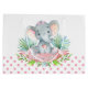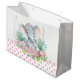 Bolsa de regalo para baby shower de niña con adorable elefante bebé niña con un lazo rosa lindo en una hoja verde y fondo de lunares rosa con pancarta. Esta bolsa de regalo para baby shower de elefante se personaliza fácilmente con el texto de su elección en la pancarta y la bolsa.