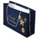 Christmas Party Golden Ornament Navy Blue Elegant Large Gift Bag. Unique, beautiful, stylish design. Easy to be personalized. Font style, size and colors can be changed. Matching items are available.