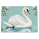 Cisne blanco elegante nadando en agua con flores sobre un diseño de fondo azul pálido.