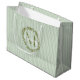 Presenta tu regalo en un estilo botánico atemporal con esta Bolsa de regalo grande de sauce rayado con monograma de corona de olivo personalizada. Con una delicada corona de ramas de olivo que enmarca tu monograma personalizado sobre un fondo rayado de color verde salvia suave, este diseño combina el encanto rústico con la elegancia moderna.